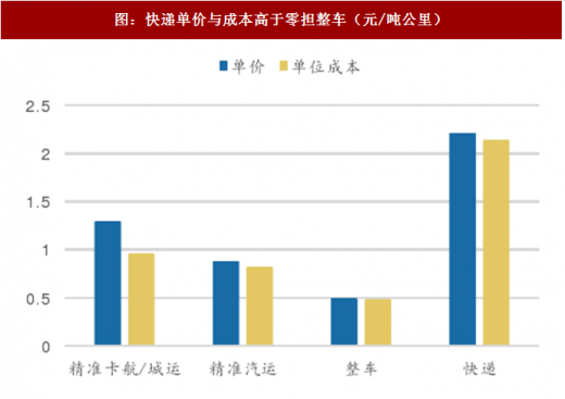零担和整车的单位价格和单位成本都比快递更低。以德邦为例:德邦快递的吨公里价格为2.21元,而其定价相对较高的高端零担产品卡航/城运的价格也只有1.3元,相对应的成本同样如此。