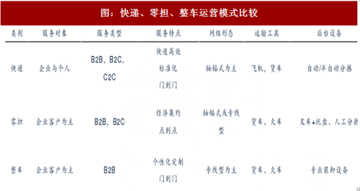 零担运输连接着快递和整车运输市场,兼具两者的特点。