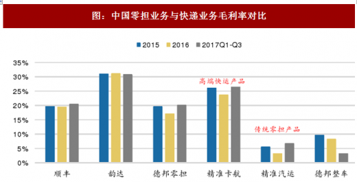 一般来说,传统的零担运输由于需要等待凑满整车,运输速度较慢,标准化程度低,成本管控较差,因而盈利能力不及快递。近年来,零担运输在采用公路零担货运的承运货物标准和业务运输模式的基础上,通过合理规划班车线路,扩充营业网点,提供固定时间、固定班次、网络化的公路班车业务,进而形成了标准化更强的公路快运业务。这类高端零担业务在盈利能力上已经逐渐赶超业务的盈利水平。