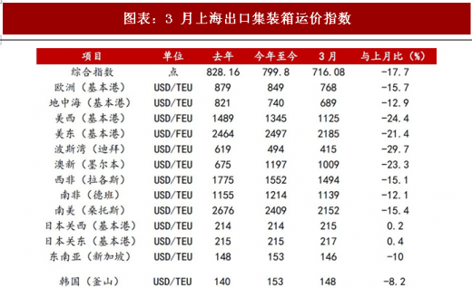 南美航线,运输需求恢复程度不及运力投放速度,供求基本面情况不佳,上海港船舶平均装载率降至70%-80%。由于前期运价处于较高水平,航商间竞相降价致市场跟跌情况加重,即期市场运价连续下跌。3 月,中国出口至南美航线运价指数平均值为 738.75点,较上月平均下跌 3.3%。