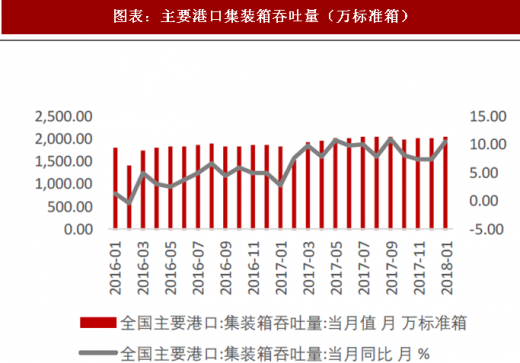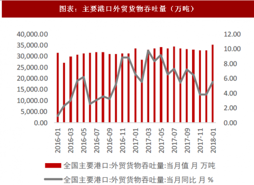 2018 年 3 月,我国规模以上港口完成货物吞吐量 104821 万吨,其中,完成 外贸货物吞吐量 33670 万吨,完成吞吐量 1966.21 万 teu。2018 年一季度,我国规模以上港口完成货物吞吐量 309235万吨,比去年同期增长 0.6%,其中,完成外贸吞吐量 101219 万吨,比去年同期增长 2.8%,完成集装箱吞吐量 5715.04 万 teu,比去年同期增长 5.5%。