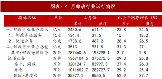 1-4 月份,邮政行业业务收入(不包括邮政储蓄银行直接营业收入)累计完成 2430.6 亿元,同比增长 23.8%;业务总量累计完成 3513 亿元,同比增长 31.3%。4 月份,全行业业务收入完成 611.1 亿元,同比增长 24.5%;业务总 量完成 931.8 亿元,同比增长 27%。