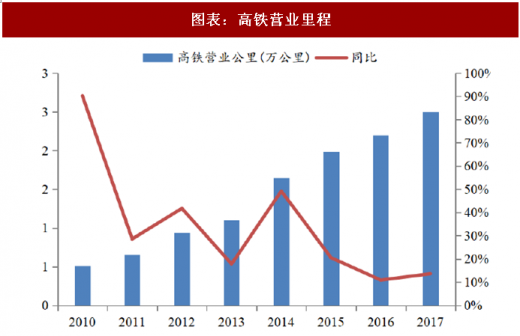 截止 2016 年,全国高铁客运量已经达到了 12.2 亿人次,9 年客运量年复合增长率达到 89.5%,2008 年至 2016 年全国铁路总客运量增长了 13.5 亿,其中 8.2 亿来自高铁,高铁贡献客运增量占到了总增量的 90%。高铁营业里程经过 2008-2014 的爆发性增长后逐步进入稳定增长区间,运营里程由 2008 年仅 0.07 万公里增加到2017 年的 2.5 万公里,年复合增长率达 49.5%。