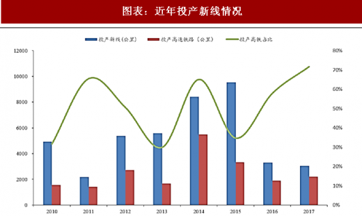 近年来投产新线中高速铁路占比不断提升,2016 年开始投产新线量大幅缩减,由 15 年 9531 公里下降 65.58%至 16 年 3281 公里。2017 年共投产新线 3038 公里,同比下降 7.41%,与此同时投产高速铁路 2182 公里,同比上升 14.66。发展高铁以来投产高铁占比曲线中枢不断上移,由2010年仅31.67%不断增长至2017年71.82%。
