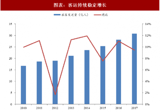 铁路客运持续稳定增长。2010-2017 年均保持正增长,期间年复合增长率 9.08%,由 2010 年 16.76 亿人增长至 2017 年 30.84 亿人,近三年增速波动趋缓,保持稳定增长。