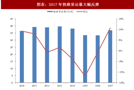铁路货运复苏强劲。2012 年以来,经济增速下滑和供给侧结构转型导致大宗物资运输需求下降,带动铁路运量同比下滑。2017 年,全国铁路货运出现明显的复苏回暖,全年累计完成货运量 36.9 亿吨,同比增长 10.7%,扭转了连续 3 年下滑的颓势。