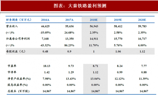 股息率稳定,防御价值凸显。大秦铁路股息支付率基本稳定在 50%以上,目前公司股息率达到 5.7%,防御投资价值凸显。2018 年是铁路改革落实兑现期,铁路货运改革是铁路改革的重大突破,将为量价增长打开空间,铁路的发展及效益有望显著改善。