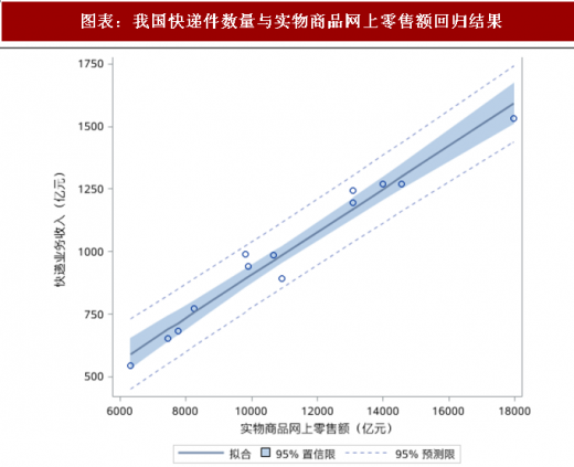 快递业收入与实物网购规模呈现高度正相关。根据 2015 年一季度至 2018 年一季度的快递业收入规模与实物商品网购市场规模数据进行回归分析,我们发现二者存在高度正相关。快递业收入规模(y)与实物商品网购市场规模(x)关系为 y=0.086x 49.86,r 方为 0.965,即网络购物市场每增加 100 亿元规模将给快递业市场带来 8.6 亿元的收入。
