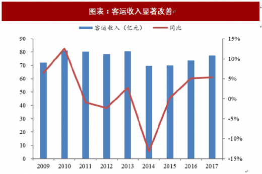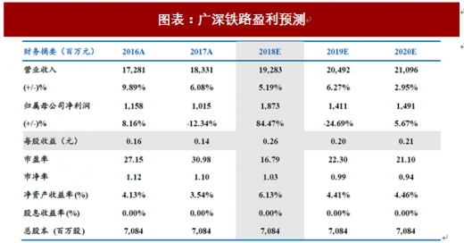 铁路客货运增长态势良好,主业增长稳定。广深铁路以铁路客运为核心业务,是内陆通往香港的唯一铁路通道。凭借广深腹地良好的基础,客流量稳定在 8000 万以上。受益于广州东至潮汕的跨线动车组增开 2 对,同时量价均有所提升,公司 2017 年客运收入同比增长 5.41%。2017 年内供给侧结构性改革持续深入、国内经济稳步向好,铁路货运量止跌回升,公司货运收入同比增长 10.2%,未来公司客货运结构有望进一步得到改善。