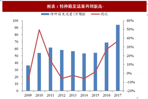 快特种箱业务发展速度加快,市场空间广阔。公司是国内铁路特种集装箱唯一运营企业,主营业务包含特种集装箱运输、铁路货运与临港物流、钢材委托加工贸易业务和开发,公司 2017 年特种箱发送量达 93.94 万标准箱,同比增长 37%,再创新高。17 年公司新增特种箱 1.7 万只,18 年计划新增 3.35 万只,发展速度明显加快。另外,我国集装箱多式联运还处于初级阶段,铁路集装箱占比不到 10%,发达国家集装箱比率集装箱在 40%上下,特种箱比率在 30%,未来特种箱发展空间仍然巨大。