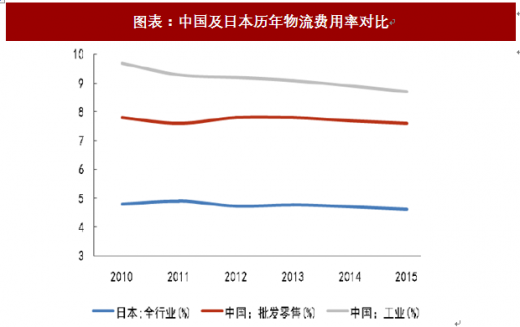 图表:中国及日本历年物流费用率对比