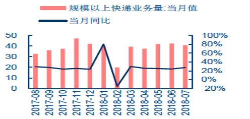 快递业务量: 2018年7月我国规模以上快递业务量达40.8亿件,比2017年同期增长27.3%。1-7月国内快递业务量累计达261.6亿件,比2017年同期累计增长 27.5%,增速仍然维持在中高水平。2018年7月快递业务量增速回升明显,根据分析主要有以下几种原因:第一,一般是快递行业“淡季”是7-8月,其件量数据通常基数较低,相比较来看,同比增速提升较为容易;第二,由于拼多多或持续交易活跃带来增量,推动快递行业较好增长;第三,大量应季上市。根据国家邮政局预计,8月份快递业务量将达42亿件,增速较7月进一步回温;2018年全年快递业务量有望达490亿件,快递业务收入5950亿元。