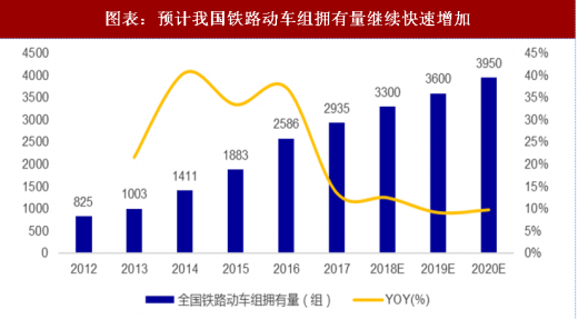 设备需求再爆发与国产化率提升共振,利好国内轨交装备企业。全国铁路动车组拥有量从 2012 年的 825 组增长至 2017 年的 2935 组,gagr28.89%。预计 2018/2019/2020 年我国铁路动车组拥有量将达到 3300/3600/3950 组。随着轨交行业国产化率不断提升,国内轨交装备企业将充分受益。