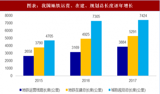 高需求带动线路投产,我国地铁运营、在建、规划总长度逐年增长。地铁节省地上空间、有效避开交通拥堵,在出行新消费方式中占据重要位置,需求旺盛。2017 年,我国地铁运营、在建、规划总长度分别为 3884/5291/7424 公里,较 2015 年增长 46%/40%/58%,预计未来将持续以较高速度增长。