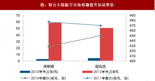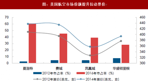 核心枢纽的资源垄断将显著提升航空公司的议价权。美国三大航空公司在垄断合并后占据了相关枢纽绝对的市场份额,通过规模效应提升通达性,牢牢把握核心旅客,带动议价能力提升。随着枢纽市场份额提升,达美航空、联合大陆航空及美国航空在优势枢纽的票价都有不同幅度的提升。