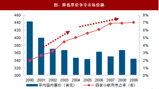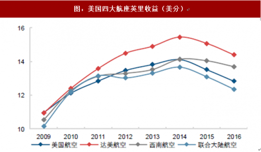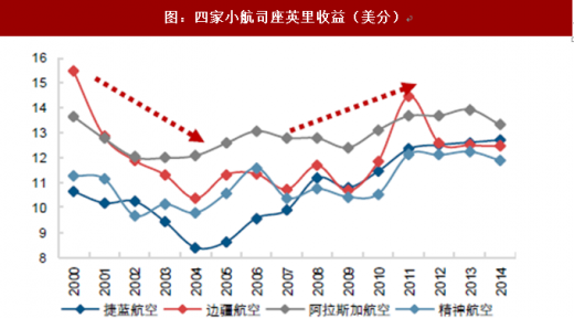在自由竞争的环境中,美国航空业曾面临激烈的价格战,新的承运人通过降低价格提升市场份额,导致行业整体票价受到压制。2000 年-2004 年行业内四家小航空公司平均客公里收益下降超过 20%,随着“次贷危机”之后的收购兼并,行业的垄断竞争格局逐步形成,大型枢纽的准入壁垒提升,小的航空公司摒弃价格竞争,座公里收益提升。