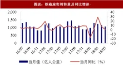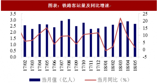 货运方面,5月铁路货运量为3.39亿吨,同比增长11.80%;1-5月累计实现铁路货运量16.28亿吨,同比增长7.20%;5月铁路周转量为2409.10亿吨公里,同比增长 10.90%;1-5 月累计铁路货物周转量 11501.01 亿吨公里,同比增长4.60%。图表:铁路客运量及同比增速