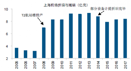 机场的折旧和摊销主要取决于扩建周期,与业务量相关性比较小。以上海机场为例,2008 年完成扩建转固,2014 年折旧成本开始下滑,主要是因为和折旧计提完毕,未来公司新建的卫星厅转固会提升折旧成本,但前期是扩建的固定资产可以缓解折旧成本压力。白云机场在 t2 投产转固后,折旧成本将快速增加,业绩在短期内承受压力,未来随着 t2 时刻放量,预计公司将开启新一轮的扩张。