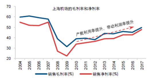 机场的扩建转固阶段,折旧成本大幅增长,从而导致利润率大幅下降。产能释放时期,营业收入持续在高位运行,大部分成本相对稳定,因此利润率不断增长,同时业绩的确定性高。