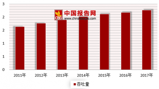 在2018年1月26日,交通运输部公布2017年规模以上港口货物、旅客吞吐量快报数据。数据显示,2017年中国规模以上港口预计完成货物吞吐量126.44亿吨,同比增长6.4%。其中,沿海港口和内河港口同比增速基本持平,分别为6.4%和6.3%,完成货物吞吐量分别为86.25亿吨和40.19亿吨;完成外贸货物吞吐量40.02亿吨,同比增长5.7%;集装箱吞吐量同比增长8.3%至2.27亿teu,且增速明显快于货物吞吐量6.4%的水平。以上相关数据与2016年同期增速相比,明显加快。