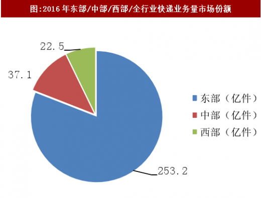 中部和西部地区快递业务量、收入增速更快。2016年,东、中、西部地区快递业务量比重分别为80.9%、11.9%和7.2%,业务收入比重分别为81.1%、10.7%和8.2%。
