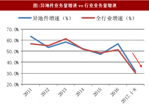 异地快递业务占比最大。2017年1-8月,同城、异地、国际/港澳台快递业务收入占比分别为14.2%、53.4%和11.3%;业务量占比分别为24.3%、73.6%和2.1%。