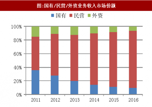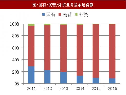 民营快递企业市场份额进一步提升。2016年国有、民营、外资企业业务量份额分别为9.1%、90.3%和0.6%,业务收入份额为10%、83.8%和6.2%。