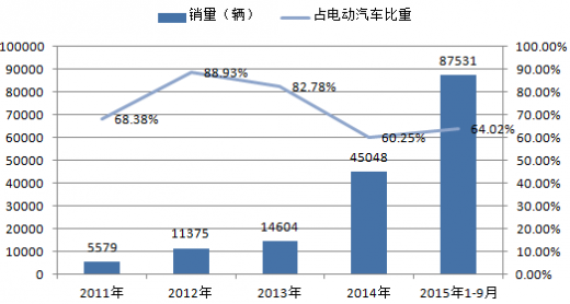 显示:在2014年,中国纯电动汽车电动车的产量仅仅只有48605辆。在2015年,主要的电动汽车类型是纯电动车,产量为93032辆。与2014年相比,纯电动车在电动汽车产量中占据了相当大的比重。