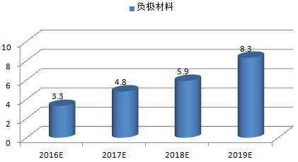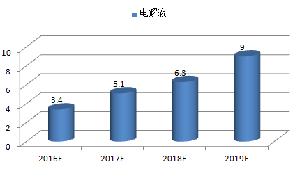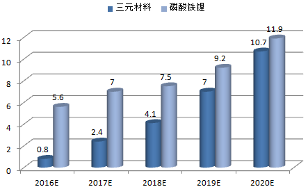 根据估算,预计2016 年正极材料、负极材料、电解液、隔膜的市场规模分别为6.4 万吨/3.3 万吨/3.4 万吨/3.7 亿平米,有望在2020 年分别增长2.5 倍/2.5 倍/2.7 倍/2.7 倍至22.6 万吨/11.5 万吨/12.6 万吨/13.6亿平米,年均增速超过35%。