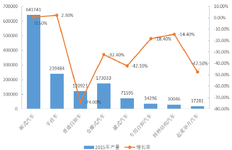 2015年除厢式汽车和半挂车略有增长外,其他六大类别的专用汽车产量都出现两位数以上的下滑。