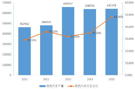 在国内的快速发展的推动下,国内厢式运输类汽车一跃成为最大的专用汽车需求产品。2014年厢式汽车超过普通自卸车,成为最大的专用汽车产品。2015年厢式汽车生产64.17万辆,在专用汽车行业占比达到48.3%。