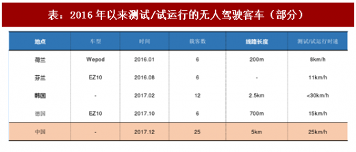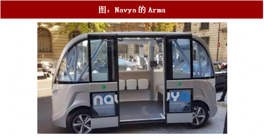 navya开发的arma,可以搭载15人,目前已经在法国的一些封锁区域运行;easymile开发的ez10,已在美国、芬兰、法国、德国等完成测试。
