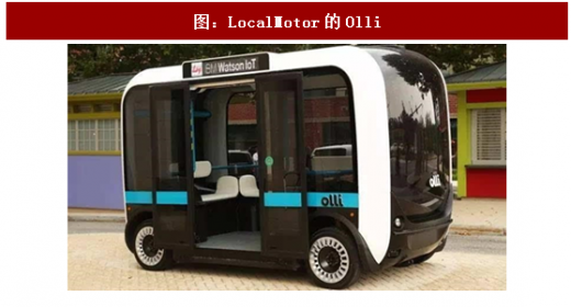 aurorobotic位于加利福尼亚,其目标是在校园、军营和老人社区等有24小时用车需求的地方运行无人驾驶接驳车;localmotor开发的olli无人驾驶公交车,被用于学校和城市交通网络无法覆盖的地方,是首款使用ibmwaston认知学习平台的汽车应用。