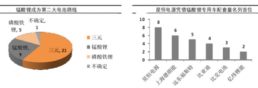 本次目录中共有9款锰酸铿电池配套产品入选,其中传统锰酸铿强者星恒电源凭借锰酸铿电池接受度在专用车领域的提高,一举获得8款配套,成为新能源专用车领域最大电池供应商,上海德朗能排名第二;远东福斯特有5款车型入选,亿纬铿能亦有2款车型入选。