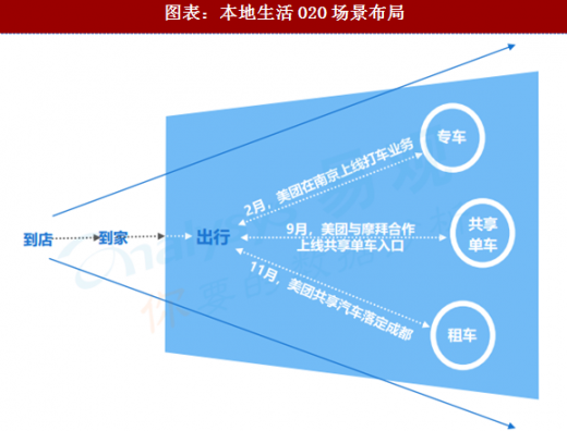美团点评继切入到店、涉足到家场景后,2017年又将业务触角延伸至网约车,入局出行市场。本地生活o2o开始实现对用户生活的线上线下,从到店、到家到旅游、出行的全场景覆盖。