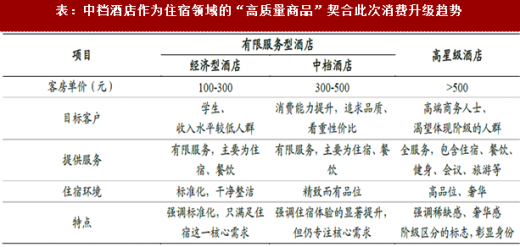 性价比是中档酒店的核心竞争力,更契合此次消费升级特征。精神消费时代消费者需求变化具体到出行住宿领域表现为:在“住得好点”的意愿驱动下,愿意为更高品质的住宿体验付出溢价,但并不追求高价格的奢华体验,性价比仍是关键指标。中档酒店在提供优于经济型酒店的住宿环境、低于高星级酒店的价格,在性价比指标上领先经济型酒店和高星级酒店,因此更受本届消费者青睐。