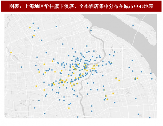 中高档酒店需要更好的商业地段,且分布密度更低。大酒店集团领先于市场进行布局,先发优势明显。我们以华住酒店为例,参考《第一财经周刊》新一线城市研究对全国11个酒店集团旗下5,869家经济型酒店及813家中档酒店的门店布局的数据分析,我们发现旗下中档酒店集中分布在更加核心的人民广场、静安寺、城隍庙以及陆家嘴。