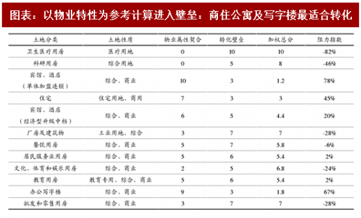 大部分业态因为进入壁垒原因很难转化为酒店物业。目前除商住物业吸引力较高进入壁垒方面较低外,其他物业业态都因存在物业吸引力不足或物业改造壁垒高的问题,由此导致在我们的模型体系下,真正适合改造成酒店物业的业态较少。