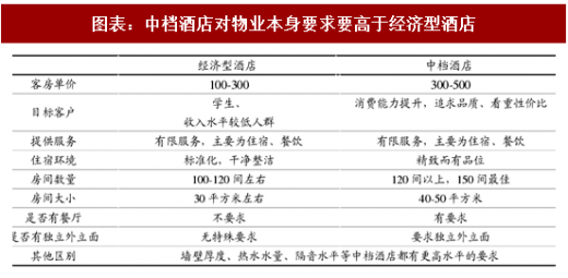 对物业的高需求是经济型酒店升级中档的主要壁垒。中档酒店对物业本身特质的要求显著高于经济型酒店:中档酒店在房间数、房间大小、外立面等方面要求更高。而上述特征为物业本身属性,较难通过后期装修改造达到中档标准。