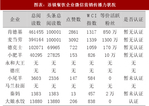 从中国报告大厅《2015 年中国餐饮连锁十大品牌企业排行榜》的前十强的数据可知,有一家连锁餐饮企业尚未开通手机微信公众平台,一家连锁餐饮企业于 2015 年 7 月才开始推送,一家连锁餐饮企业直至 2015 年 12 月底才正式推出,余下的七家连锁餐饮企业均早先开通。其中,在所关注的微信公众账号中,九家连锁餐饮企业都为服务号,无一家是订阅号,且只有一家连锁餐饮企业通过认证,其余均是暂无认证状态。由此看来,大部分企业还是把微信公众平台真正的运用到营销服务之中,但是还没有充分地重视,也没有认识到微信公众平台的重要程度。此外,从前十强连锁餐饮企业中存在着尚未开通微信公众平台的情况,说明部分的连锁餐饮企业对微信及微信营销持观望的态度,还是不能发现微信所带来的巨大市场潜景和无限商机,仍旧青睐于传统的营销模式。毋庸置疑,这对连锁餐饮企业未来的发展是有害无益的。