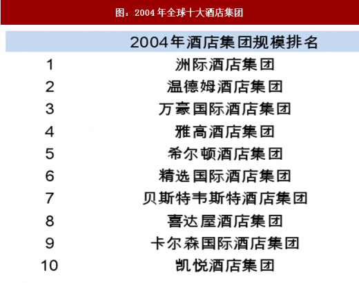 2004年,酒店行业管理规模靠前的酒店集团或是美国公司(如万豪、希尔顿、喜达屋、温德姆等),又或是学习美洲模式的欧洲公司(如雅高)。