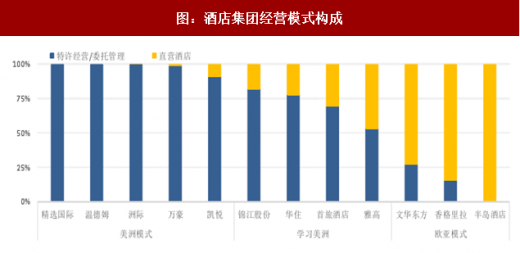 而我们熟知的,起家于香港和东南亚的香格里拉、半岛酒店,以及文华东方等则为欧亚模式的代表,酒店由直营店,特别是自有物业的直营店为主,重资产、强调酒店的调性和管理品质,可以看到他们的直营比例都在70%以上。欧亚模式的核心是酒店物业的碎片化,即业主仍然占据酒店行业的核心话语权。