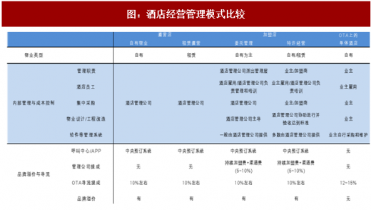 除了延续欧亚模式,形成具备区域和地方特色,坚持自有和直营引导发展之外,一部分中国的酒店管理公司还将体现出平台化的特征,即为单体酒店提供导流,实现自身的轻资产运营和品牌价值最大化。我们对比了大型酒店管理公司旗下的直营店、加盟店与依靠ota导流的单体酒店的经营管理模式。