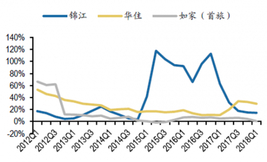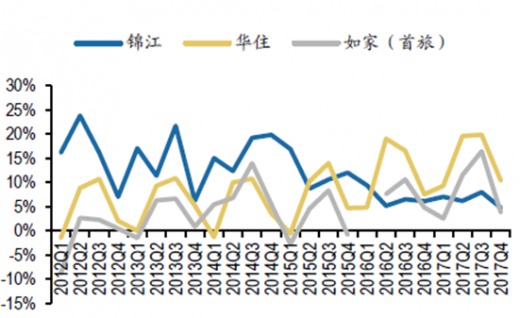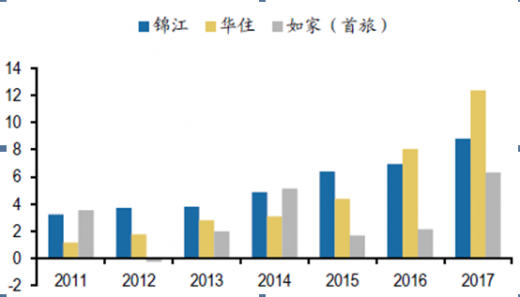 营业收入方面,锦江营收规模最大,并购以后的内生增长也较快;华住和首旅营收规模相当,但华住营收增长快于首旅。三大酒店中,锦江营收规模最大,并购后内生增长也较快,17年锦江在考虑并表因素情况下达到了27.7%的高增长。17年5月华住并表桔子水晶,营收增长有所提速,单四季度增速达32.6%,营收全年增速达到25%。首旅营收规模大致和华住相当,营收全年增速达29%。2018年1季度锦江的营收增速为14.5%,如家营收增速为0.62%,华住营收增速为29.6%(华住18年1季度存在桔子水晶并表因素)。