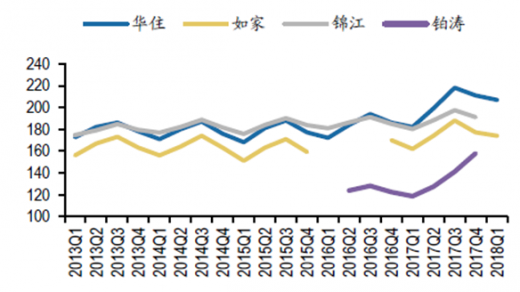 华住整体经营数据领先,出租率和平均房价在三大集团中均表现最好。华住17年revpar为181元/晚,同期如家revpar为148元/晚,锦江旗下的锦江系和铂涛系revpar分别为147元/晚和124元/晚。华住17年出租率达到86.0%,如家为83.7%,锦江和铂涛分别为77.1%和80.8%。平均房价方面,华住为211元,如家为177元,锦江和铂涛分别为191元和158元。华住出租率和平均房价均表现领先,锦江平均房价较高,但出租率较低,如家出租率优于锦江,但房价低于锦江,铂涛的房价最低,拖累其revpar表现。