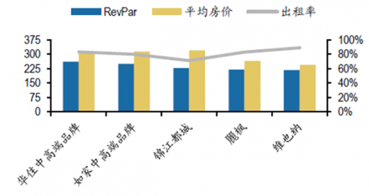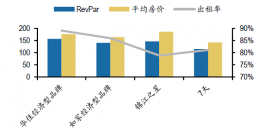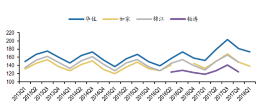 分品牌来看,三大集团中高端酒经营差距不大,经济型酒店华住经营指标明显占优。18 年第一季度,华住中高端酒店同店 revpar 为 261 元/晚,如家中高端同店 revpar 为 250 元/晚,锦江旗下的锦江都城、麗枫和维也纳 revpar 分别为 227 元/晚,219 元/晚和 217 元/晚,考虑到锦江旗下的麗枫和维也纳新开店数量多,成熟门店经营数据应该更好,因此三大集团中品牌经营指标差距不大。经济型品牌方面,华住 18 年第一季度经济型同店 revpar 为 156 元/晚,如家为 140 元/晚,锦江之星和 7 天分别为 146 元/晚和 115 元/晚,由于利润空间较小,revpar 对利润的弹性贡献大,所以华住经济型酒店的经营优势非常显著。