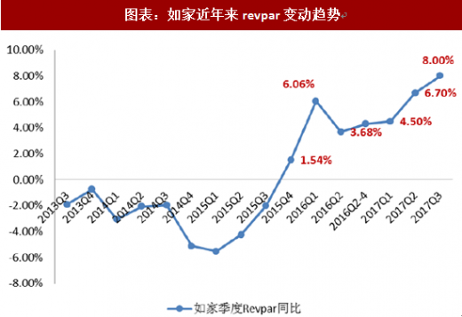 与经济型酒店不同的是,中端酒店的住宿面积、条件等都更优越,价格也高于经济型酒店,自2013年中端酒店在数量上形成一定规模,近几年来增速可观,但在有限服务型酒店中仍然占比较低,中端酒店与经济型酒店的比例必然将持续调整。随着中端酒店占比不断提高,酒店行业龙头公司经营业绩持续向好。例如,锦江股份旗下中端品牌锦江都城2018年1月revpar为202.43元,同比增长17.31%,增速继续呈现上升趋势。此外,截至2018年1月锦江旗下各品牌中中端酒店占比25.15%,但2018年1月锦江净开业酒店数25家,经济型酒店净减少1家,中端酒店净增26家,品牌升级趋势明显。