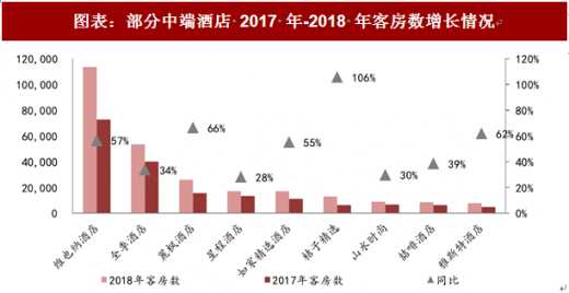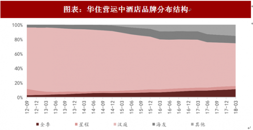 以华住酒店为例,2018年1季度,星程、汉庭、海友等品牌分别增加-1家、1家、 -5家,而全季增加了33家门店。华住旗下中端酒店数量不断增长,其中全季酒店从2012年9月的26家增长至2018年3月的423家,增长了16倍,同期华住旗下酒店总数增长仅为4倍。