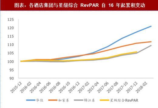 三大酒店集团经济型同店 revpar 复苏略强于行业。锦江早期没有公布经济型同店数据,锦江之星近年来酒店数增速不快,在一定程度上可以代表锦江的经济型同店情况。各酒店集团经济型同店 revpar 增速从 2016 年 10 月起先后转正,此后大部分时间增速高于二星级酒店 revpar。(注:二星级酒店数量历年不断下降,因此 revpar 存在幸存者偏差现象,真实值增速应更低些)