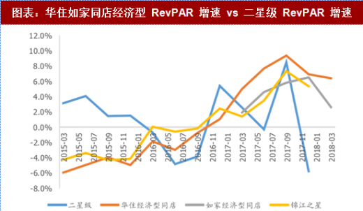 此轮行业复苏从 2016 年初开始,三大酒店集团复苏势头强于全国星级酒店综合 revpar。从 16 年初开始,三个酒店集团的综合 revpar 由负转正,增速普遍高于星级综合 revpar,在一定程度上可以看出酒店集团景气度优于酒店行业;但是综合 revpar 中包含了结构性变化(中端占比问题)和新开店的影响(新店爬坡期),因此可靠性有限,下面我们将用二星级酒店对经济型同店、三四星级酒店对中高端同店分别对比星级酒店和三个酒店集团的景气程度。